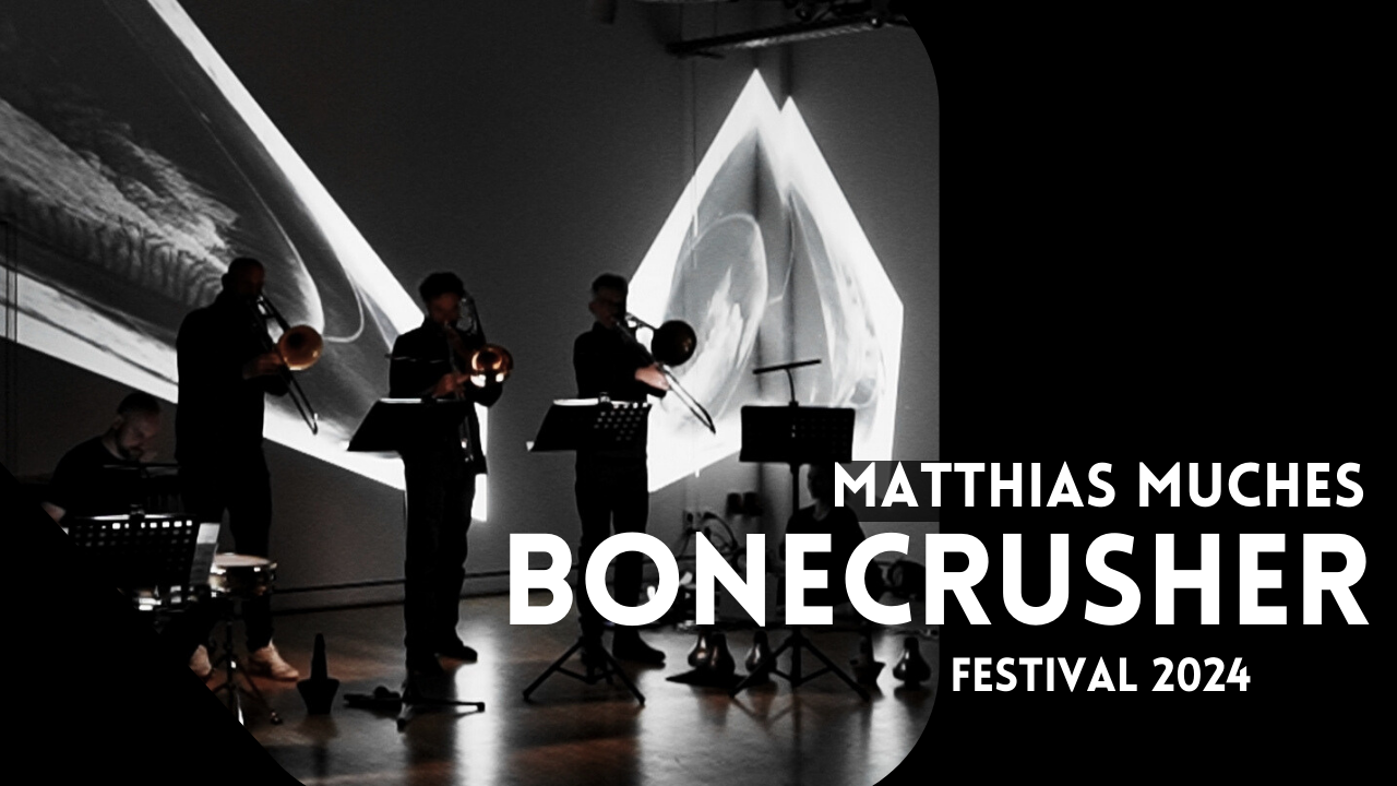 Matthias Muches BONECRUSHER - 10 trombones & percussion - plays music that ranges from sound-sculpture noise drones to walls-of-Jericho-collapsing blasts to delicate webs of air and tone, resonating overtones with layered articulations. Pushing the acoustic properties of the instrument and the physicality of the players to their limits and beyond, the musicians put their archaic contraption through the bone mill, pulverizing it, sublimating it, and breathing new life into it.